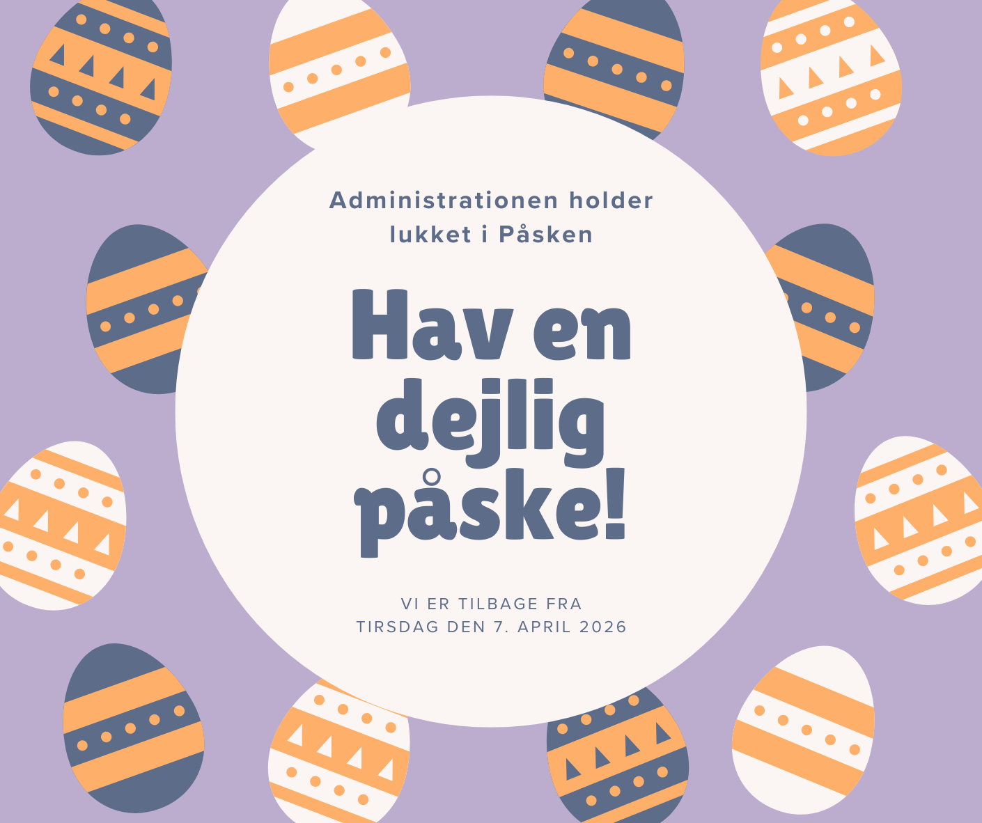 Vi kan træffes i dag (fredag) til kl. 12:00 og vil derefter først være tilbage fra tirsdag den 7. april.