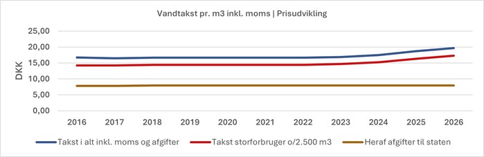 Afgifter til staten for ledningsført vand pr. m³ vand: 6,37 kr. + moms, er inkl. i vandtaksten |