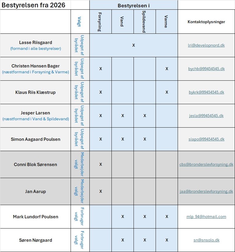Udpeget af byrådet | Forbruger repræsentant | Medarbejder repræsentant | Brønderslev Forsyning A/S | Brønderslev Vand A/S | Brønderslev Varme A/S | Brønderslev Spildevand A/S |